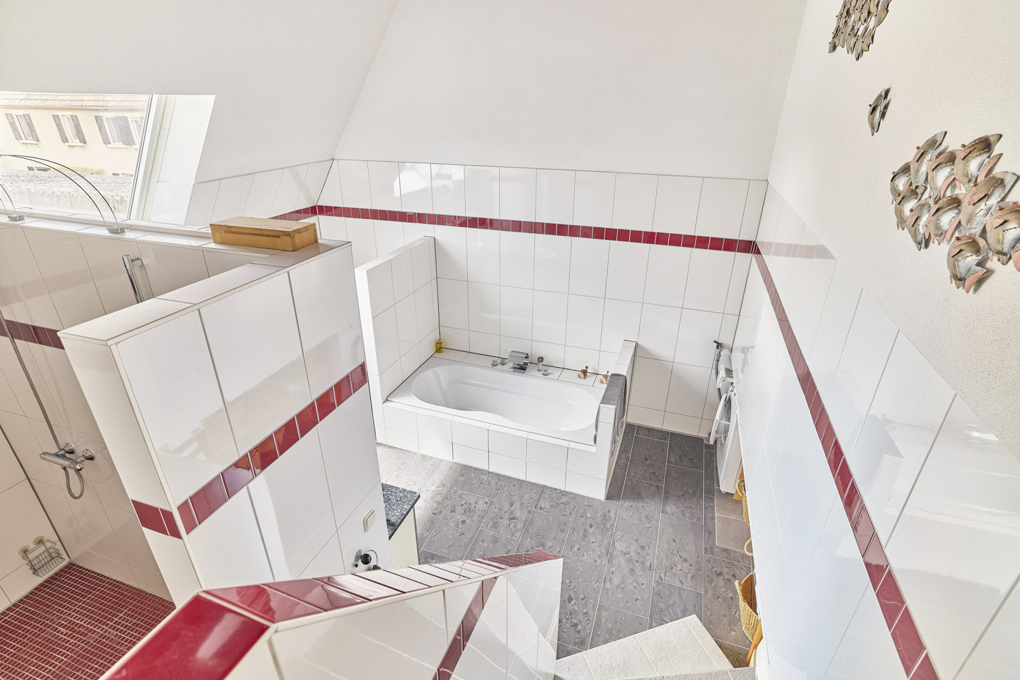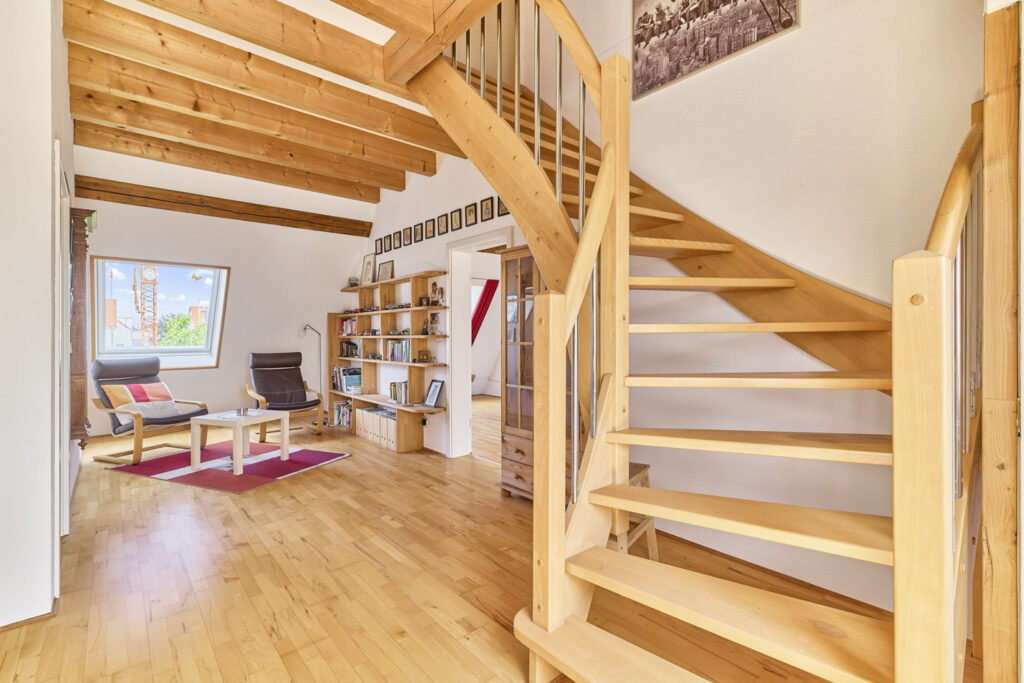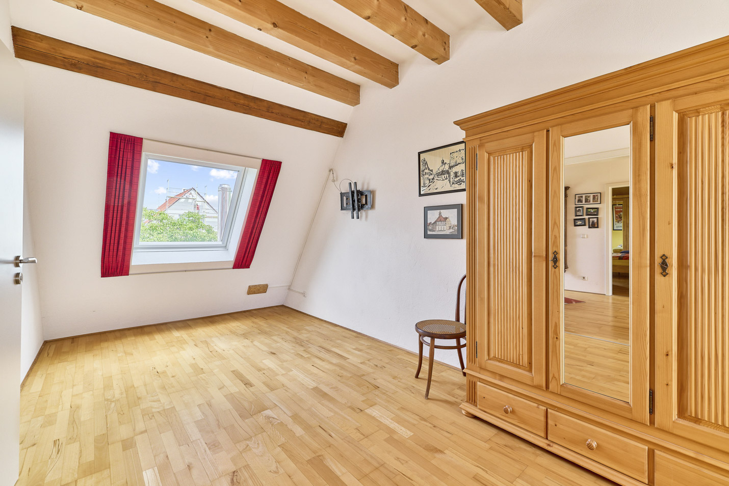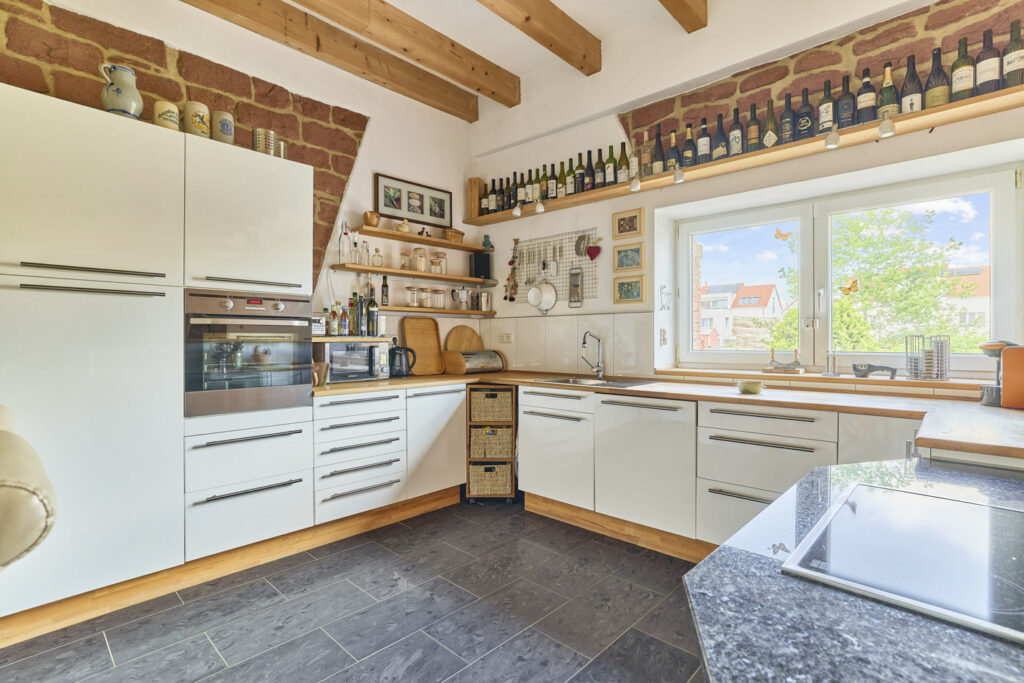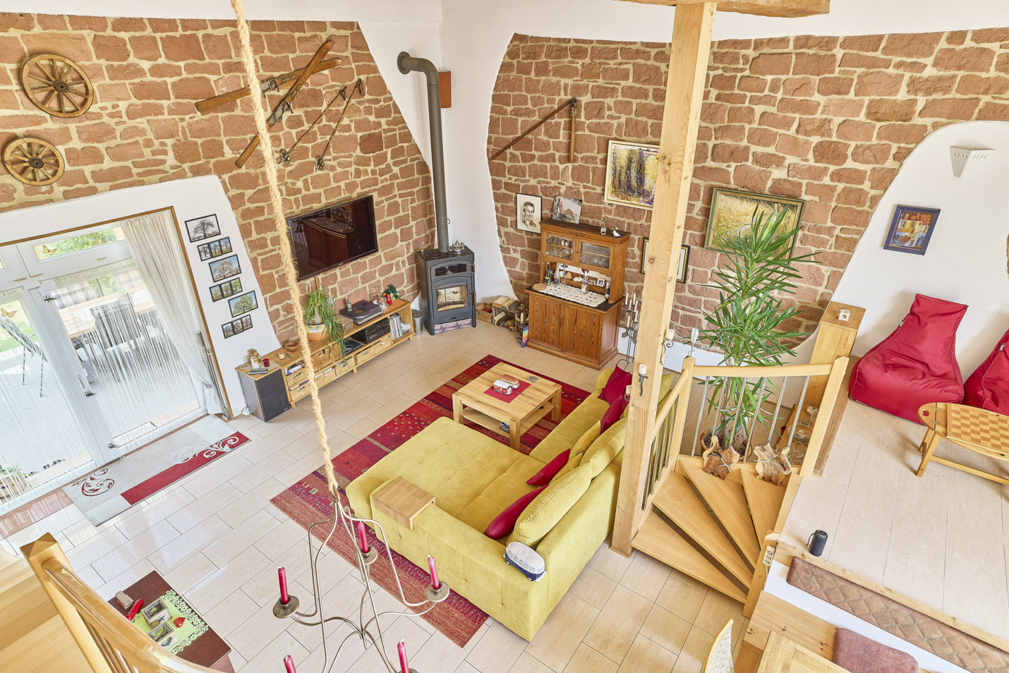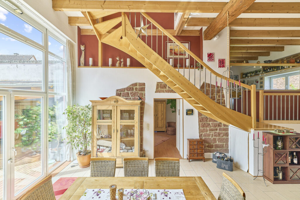 Besonders auffällig ist die hohe Glasfront an der Eingangsseite, die das gesamte Erdgeschoss mit Licht durchflutet. Dieses Haus wird durch ein separates Hoftor vom Vorderhaus abgegrenzt, was die Privatsphäre wahrt. Eine Besonderheit des Hauses ist das Sichtmauerwerk mit speziell aufgearbeiteten Sandsteinen. Das gesamte Haus wird durch eine Gas-Zentralheizung und Fußbodenheizung beheizt. Im offenen Wohn- und Essbereich befindet sich ein moderner Holzofen mit geschlossenem Backfach, der genügend Leistung erzeugt, um das gesamte Erdgeschoss zu heizen. Die beeindruckende Deckenhöhe von etwa 4,70 Metern vermittelt ein besonderes Raumgefühl. Über das Wohnzimmer gelangen Sie direkt auf die Terrasse und den etwa 380 m2 großen Garten mit Teich, Bachlauf, gemauertem Gartenhaus und eigenem Brunnen. Im Erdgeschoss haben Sie zudem nach wenigen Stufen Zugang zur Küche, von der aus Sie den gesamten Wohnbereich überblicken können. Ein Flur mit Leseecke im Obergeschoss führt zu zwei weiteren Zimmern. Auch diese Etage besticht durch eine Deckenhöhe von etwa 3,30 Metern. Das ausgebaute Dachgeschoss, das über eine weitere Treppe erreicht wird, wurde bisher als Party- oder Fitnessraum genutzt. Wasser- und Abwasserleitungen sind bereits vorhanden, sodass hier bei Bedarf ein weiteres Bad für eine zusätzliche Wohnebene eingebaut werden könnte. Das Anwesen wird durch die Kombination aus dem Erhalt des ursprünglichen Charakters und modernem Design zu einem einzigartigen Objekt. Bei Bedarf können die Häuser auch separat erworben werden.