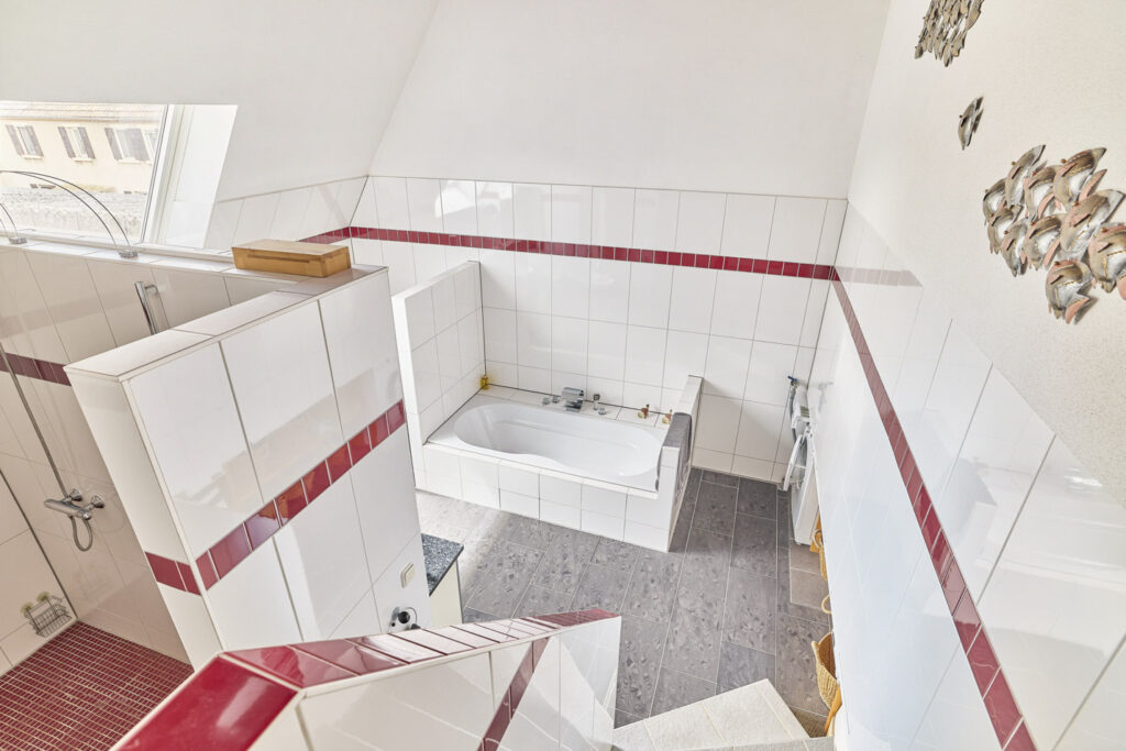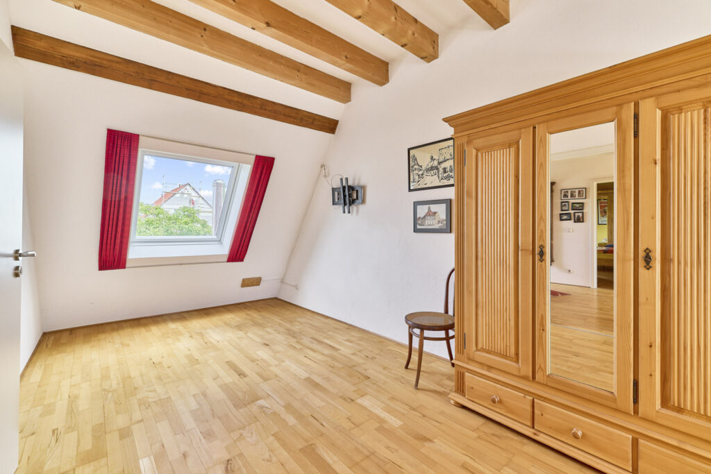 Dieses ist derzeit für 847e Kaltmiete an eine junge Familie vermietet, die gerne weiterhin dort wohnen würde, jedoch bei Bedarf freiwillig ausziehen würde. Die markante Deckenhöhe von etwa 2,80 Metern zieht sich durch das gesamte Erdgeschoss und bewahrt den ursprünglichen Charme des Hauses. Im ausgebauten Keller befinden sich ein Büroraum und ein komplettes Bad, das in einer Nische die Gasheizungsanlage beherbergt. Das Obergeschoss umfasst zwei Schlafzimmer und ein geräumiges Bad. Über den Hof gelangen Sie zu dem von außen verputzten Sandsteinhaus.